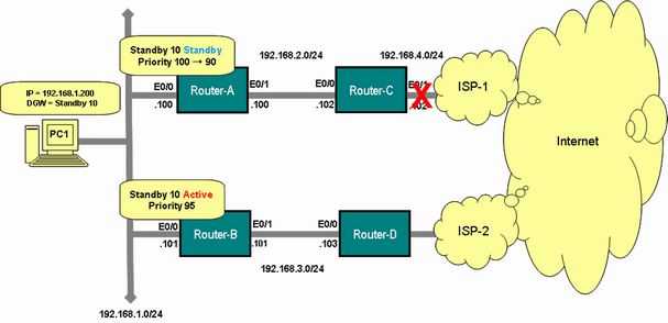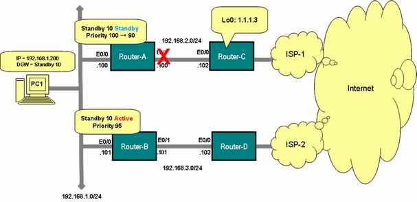 今回は、Router-A とC の間のリンクが1本以下になったら、Standby Group のプライオリティを下げ、2本以上になったら、プライオリティを元に戻すように設定します。