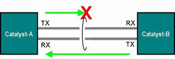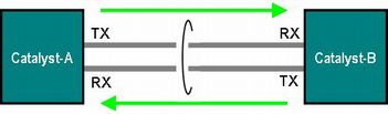 上図では、Catalyst-A のTX から送信されたフレームはCatalyst-B のRX で、Catalyst-B のTX から送信されたフレームはCatalyst-A のRX で、正常に受信できています。